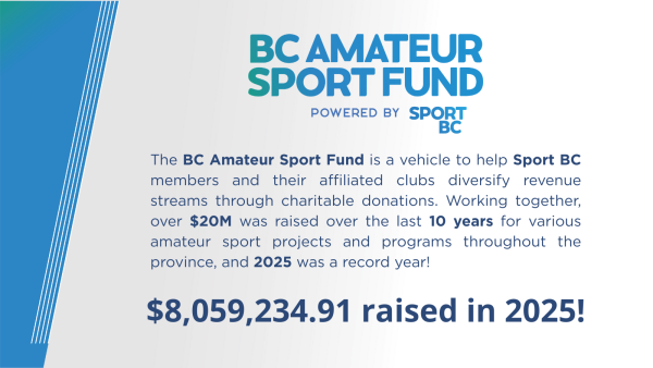 As a registered Canadian Amateur Athletic Association (RCAAA), the BC Amateur Sport Fund is able to issue an official tax receipt for all qualifying donations of $20 or greater. The BCASF has provincial chapters across Canada, with Sport BC as the Fund Manager of the BC chapter.